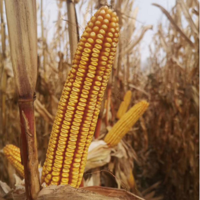 普通玉米品种。在适应区出苗至成熟生育日数为122天左右,需≥10°C活动积温2500°C左右。该品种幼苗期第- -叶鞘紫色,叶片深绿色,茎绿色。株高285厘米,穗位高112厘米,成株可见16片叶。果穗圆锥型,穗轴红色,穗长20.9厘米,穗粗4.9厘米,穗行数14~16行,籽粒马齿型、黄色,百粒重40.6克。两年品质分析结果:容重759~767克/升,粗淀粉72.85%~75.35%,粗蛋白11.52%~11. 54%,粗脂肪3.17%~3.78%。三年抗病接种鉴定结果:中感至感(5+~7)大斑病,丝黑穗病发病率11.1%~23.8%,茎腐病发病率2.3%~5.6%。