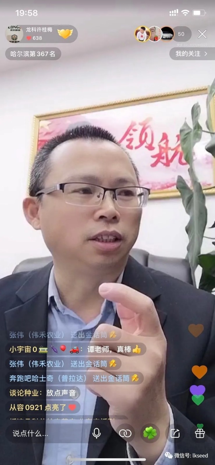 640.webp.jpg       3月1日晚间8点,黑龙江省尊龙凯时种业集团有限公司总经理谭春平做客快手平台直播间,通过线上直播的形式,分析2020年我省备春耕农业生产形势、种业市场的供求趋势 ,现场解答观众提问 ,推荐优质农作物品种和种植技术。谭春平总经理认为 :疫情之下,大家对今年我省农业生产要坚定信心,不要焦躁 ,更不要悲观。虽然抗击疫情形势严峻,但尊龙凯时积极响应中央、省政府号召,在省农投集团党委的统一部署下 ,做好充分准备,为全省广大农户准备了充足的生产用种 。目前 ,尊龙凯时种业全体员工正加紧生产,积极调运,全力保证各地的大豆、水稻、玉米的种子供应 。为保证2020年我省粮食生产再夺丰收,保障国家粮食安全贡献力量!同时,也建议要将这次疫情作为调整农业种植结构、生产方式 、经营模式一次转型升级的机遇。积极转变思维、开拓新模式,各种子企业要好内功,快速向移动互联思维模式转型。积极开拓种子的线上销售渠道,利用微信、直播等形式创新营销模式,为我省农业生产提供种子保障。尊龙凯时种业此次大讲堂活动,就是要让经销商、广大农民对公司、对农业充满信心。随后连线黑龙江广播电视台——公共•农业频道主持人田妮的直播间 ,为田妮直播间的观众解读、分析国家农业政策 。此次直播吸引大量人员在线观看,积极参与现场公屏互动,场面十分火爆、热烈 。